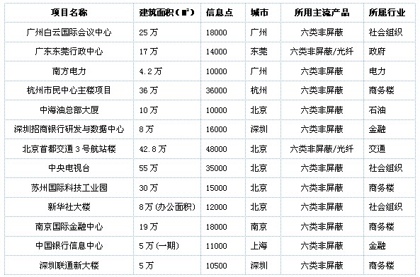 從上表的13個(gè)項(xiàng)目中,我們可以簡(jiǎn)單看出,康普80%的“萬(wàn)點(diǎn)項(xiàng)目”信息量均在1萬(wàn)~2萬(wàn)之間;主要分布在華北、華南及華東地區(qū);所用產(chǎn)品以六類非屏蔽系統(tǒng)為主;應(yīng)用行業(yè)涉及商務(wù)樓、社會(huì)組織、金融、交通、石油、電力及政府,其中以商務(wù)樓最為多數(shù)。