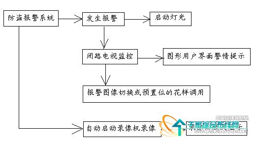 本工程安全防范系統(tǒng)由視頻監(jiān)控系統(tǒng)、入侵報警及周界防范系統(tǒng)、電子巡更系統(tǒng)組成。各個子項的高度集成是本系統(tǒng)的主要特點,各子系統(tǒng)既單獨的運行,又相互聯(lián)系。并實現(xiàn)以下圖的聯(lián)動功能: