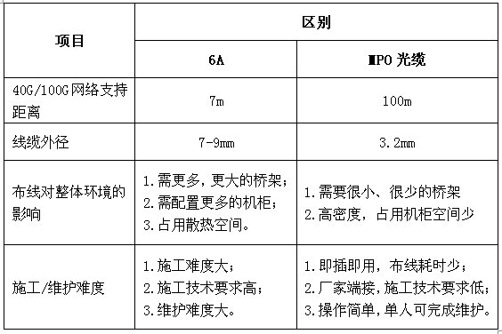 我們來對(duì)比下傳統(tǒng)銅纜和MPO光纜的一些區(qū)別: