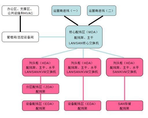 主配線區(qū)域(TheMainDistributionArea,MDA):主配線區(qū)包括主交叉連接(MC)配線設(shè)備,它是數(shù)據(jù)中心結(jié)構(gòu)化布線分配系統(tǒng)的中心配線點(diǎn)。MDA包括主配線架并可能還包括為附近設(shè)備提供連接的水平配線架(HDA中描述)。MDA可能與核心路由器、核心LAN/SAN交換機(jī)連接。有時(shí),服務(wù)提供商的設(shè)備(如MUX多路復(fù)用器)也被放置在主干區(qū)域以避免線纜超出額定傳輸距離。