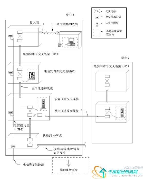 注意:為了適用于所有的樓宇,術(shù)語選自TIA-568-C標(biāo)準(zhǔn)。布線子系統(tǒng)1通常定義為水平鏈路。布線子系統(tǒng)2和布線子系統(tǒng)3定義為(垂直主干)。園區(qū)布線有其自己的主干系統(tǒng)區(qū)別于常規(guī)的2層主干布線子系統(tǒng)2和布線子系統(tǒng)3。標(biāo)準(zhǔn)允許在布線子系統(tǒng)1中一層的交叉連接,在布線子系統(tǒng)2和3中有兩層的交叉連接。這個條款使得標(biāo)準(zhǔn)更加的通用不僅可以應(yīng)用與數(shù)據(jù)中心,同樣也適用用商業(yè)樓宇、住宅樓宇、工業(yè)建筑和醫(yī)療建筑等。